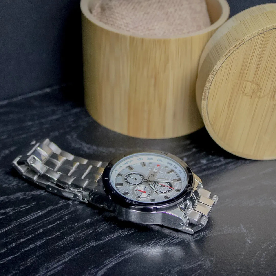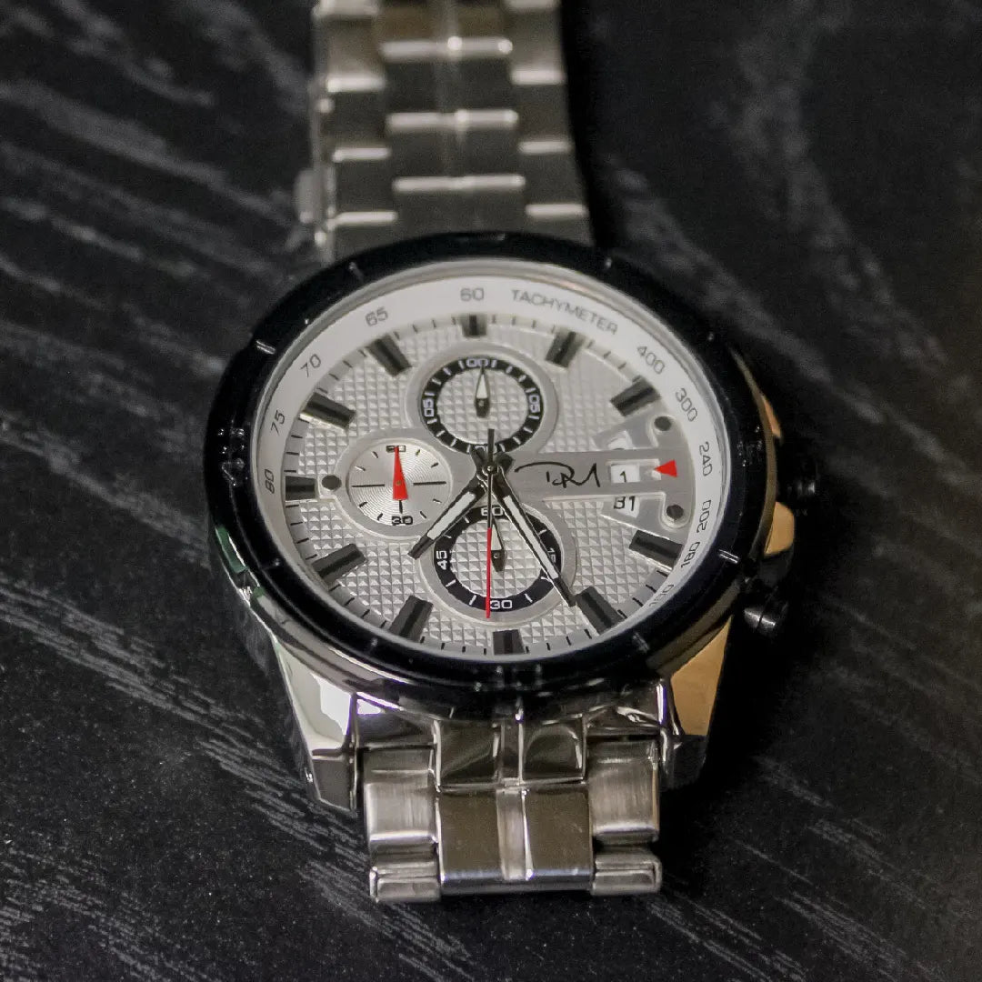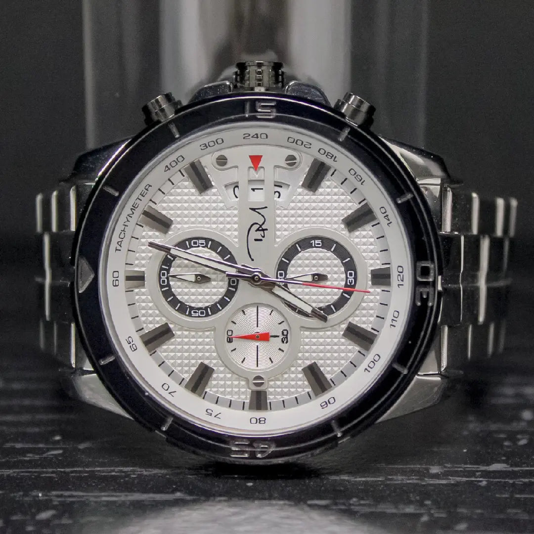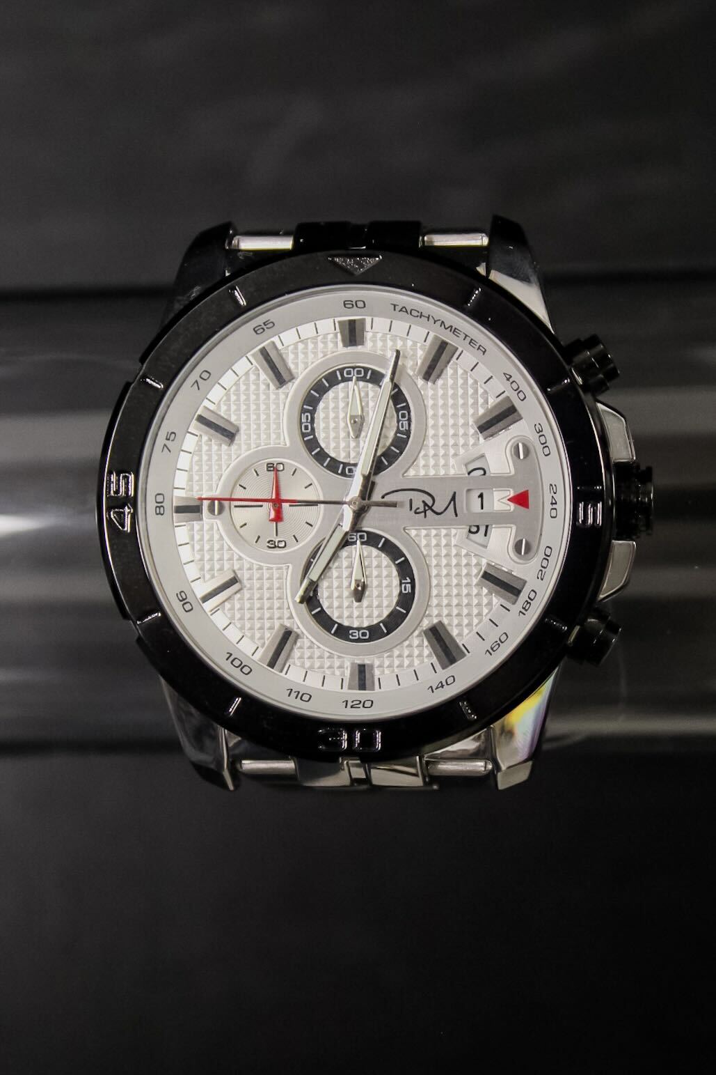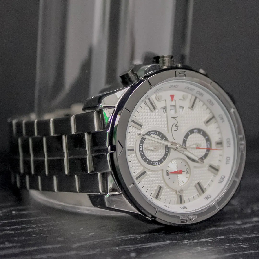 The Omicron 3 men's watch is composed of a silver stainless steel band with a silver face underlayment, that provides a distinct, masculine look. With a cutting-edge silver, chiffon white, and onyx black colorway, amongst three silver-framed chronographic dials, and muted fossil grey and onyx black details, this watch resembles that of a knight in shining armor.