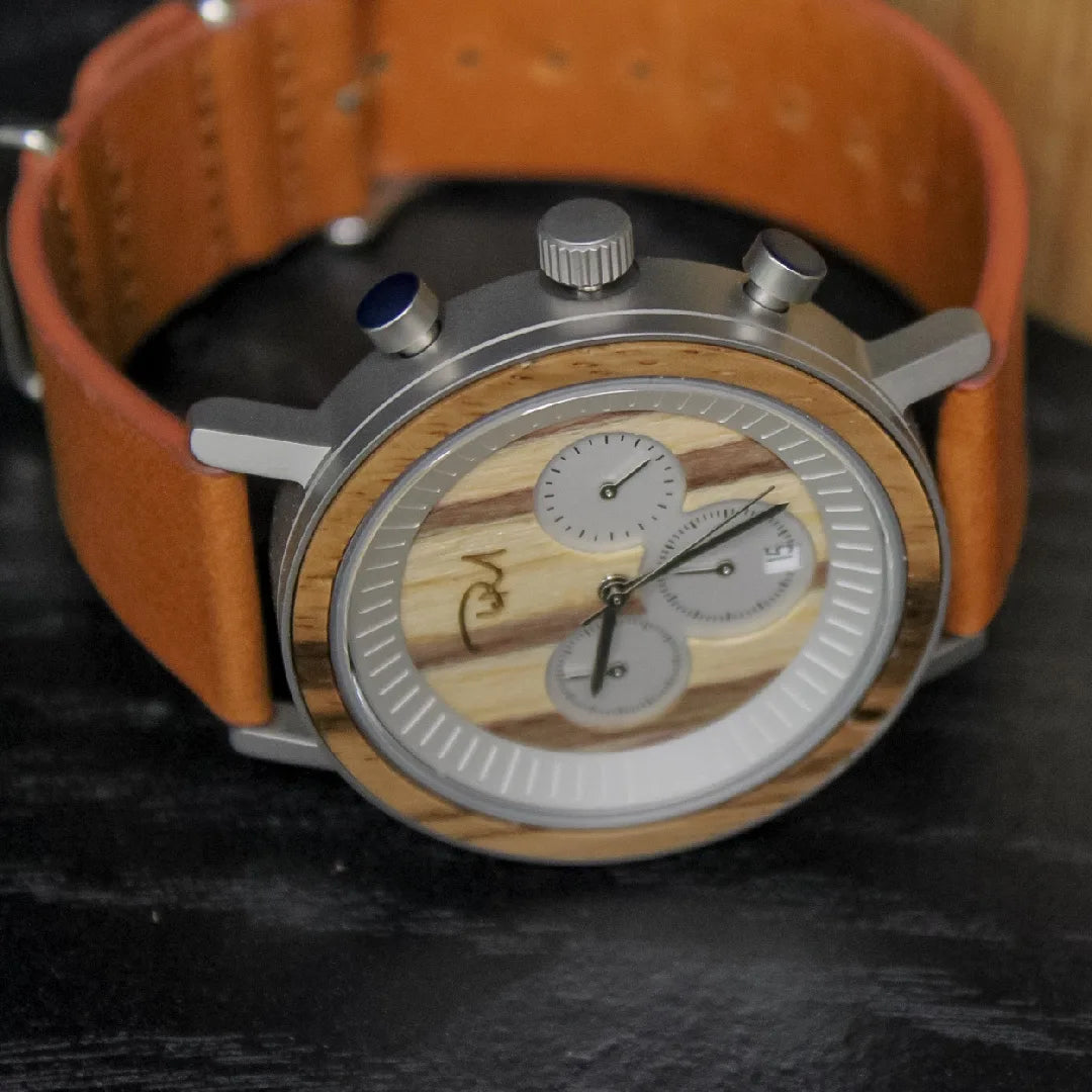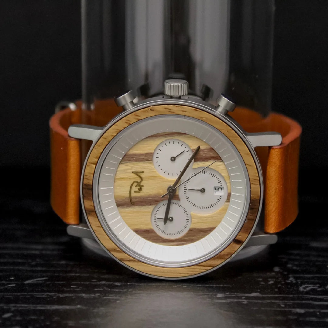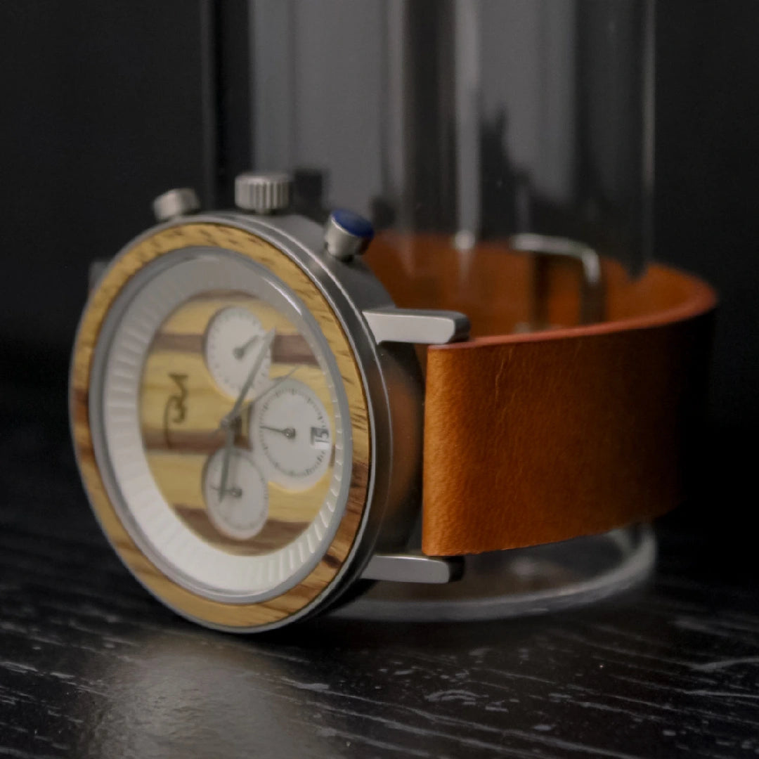 The Eta men's watch is fabricated from a walnut-colored leather band that transitions into a smooth and brilliantly designed light zebrawood face presenting a design of enchanting measures. With a pleasant pop of three white chronograph dials and silver details, this watch represents the serene golden sunsets over the ranch.