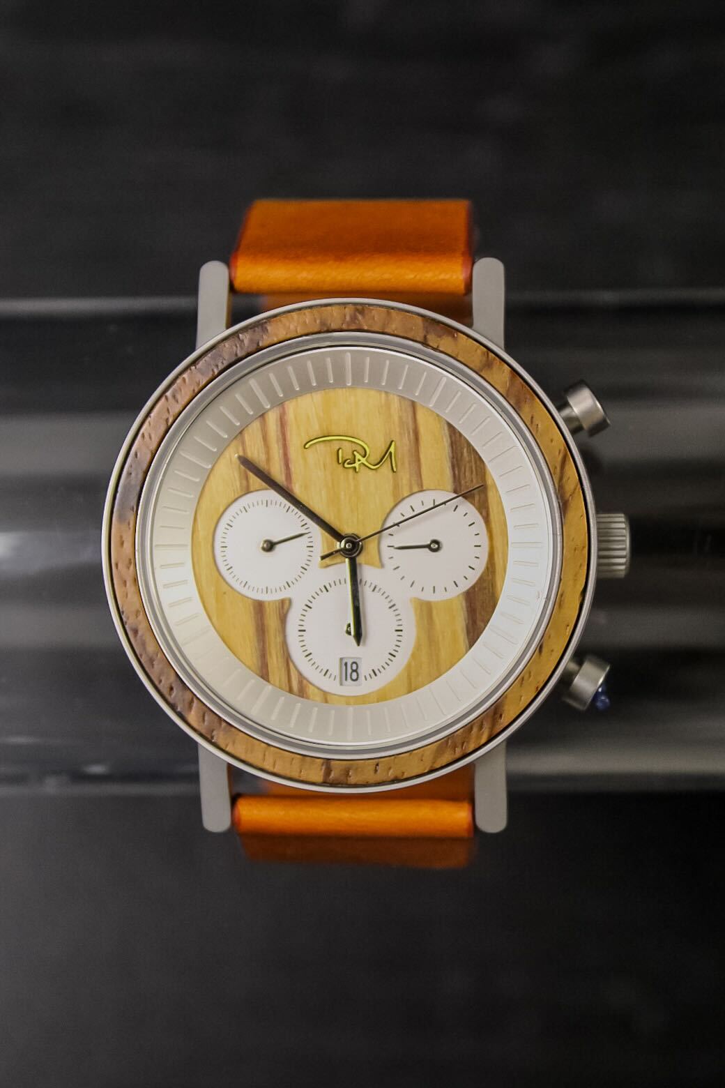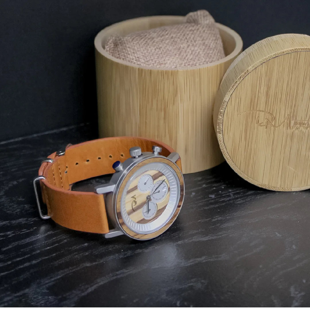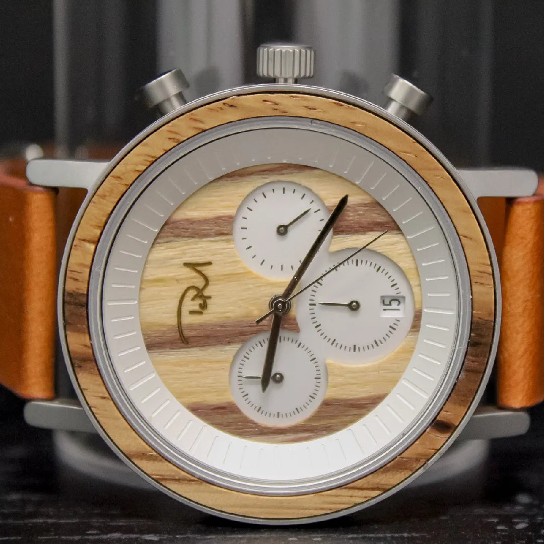 The Eta men's watch is fabricated from a walnut-colored leather band that transitions into a smooth and brilliantly designed light zebrawood face presenting a design of enchanting measures. With a pleasant pop of three white chronograph dials and silver details, this watch represents the serene golden sunsets over the ranch.