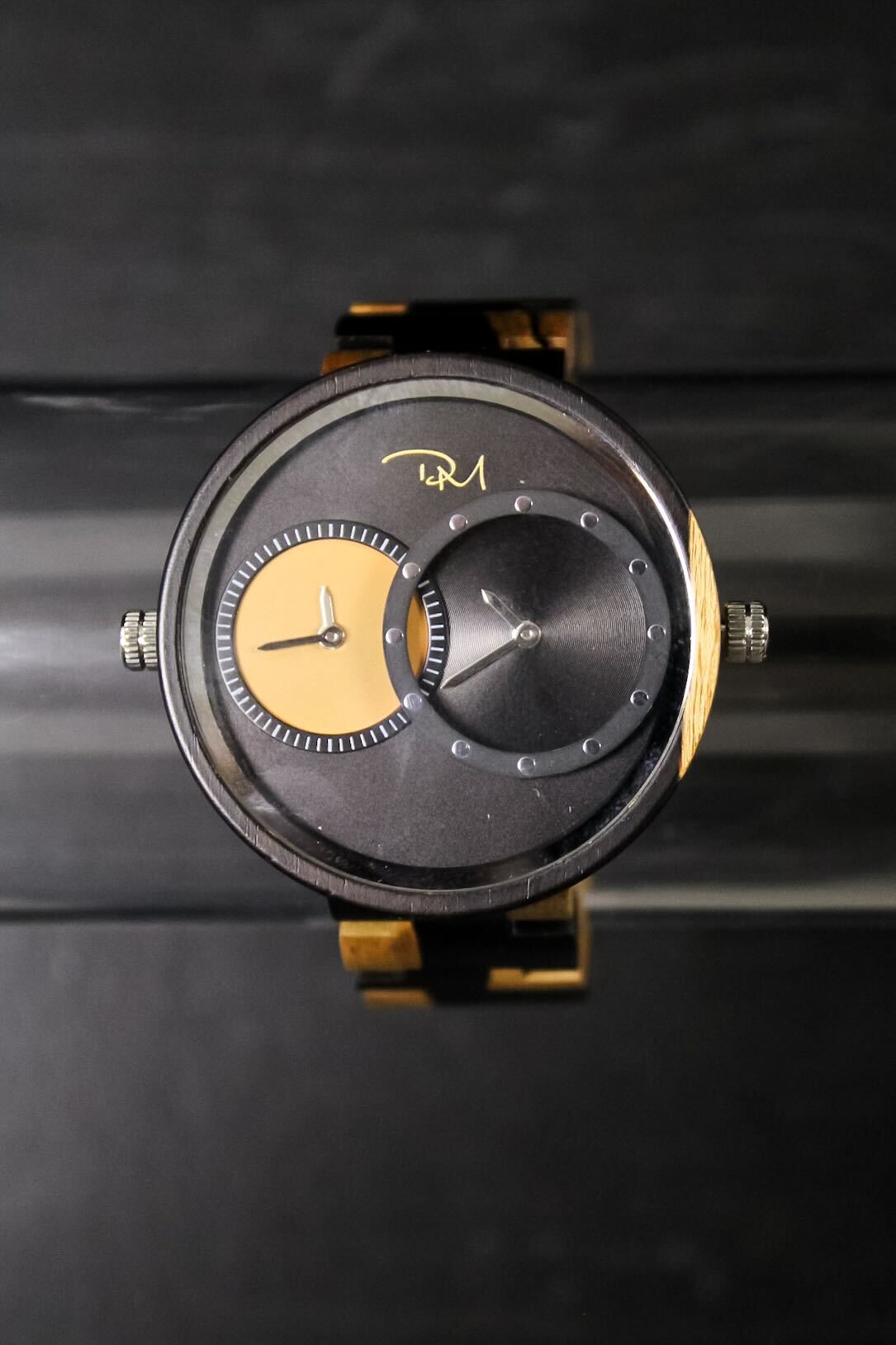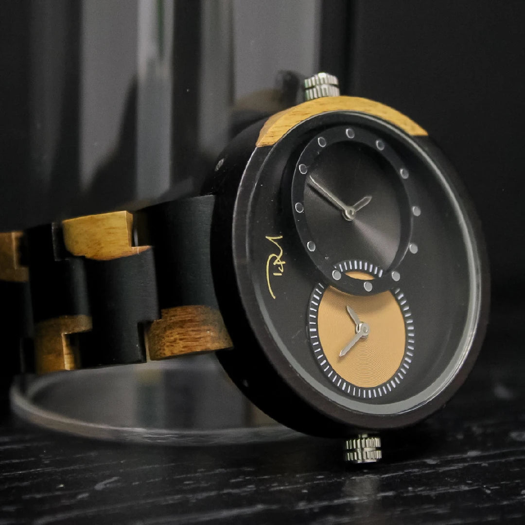 The Nu 1 men's watch is developed from a mottled black and white wood band, meant to provide a crisp, harmonious look. With polished jade black and black/white wood colorway that seamlessly transitions into two jade black and bumblebee yellow chronograph dials and chiffon white details, this watch resembles the imaginative daydreamer that is ready to take a chance and dive into the deep end.